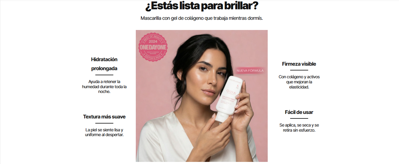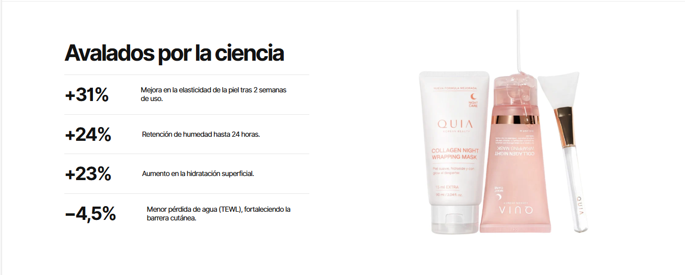 Su película de colágeno crea un “sello” invisible que potencia el triple cuidado:firmeza · hidratación · luminosidad.